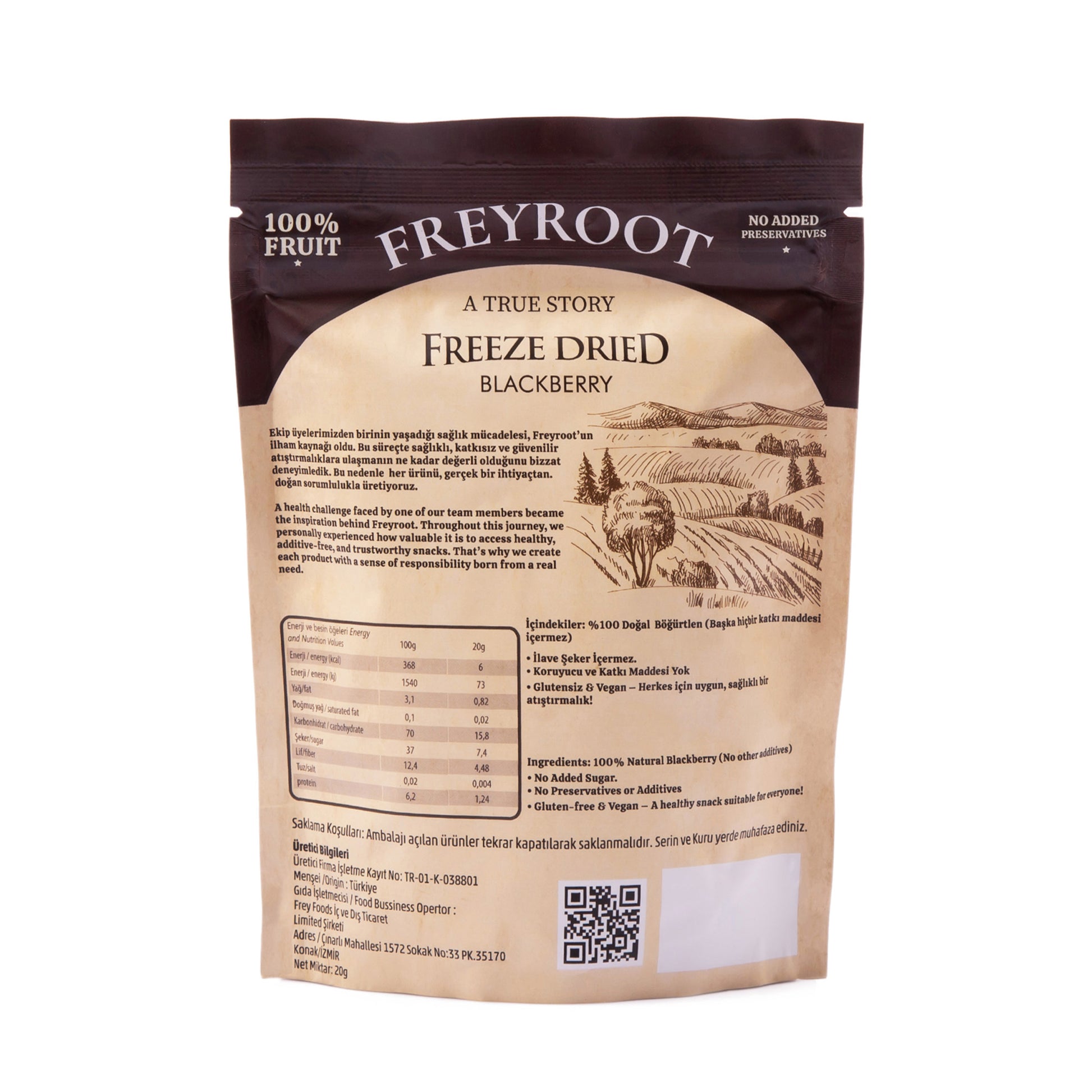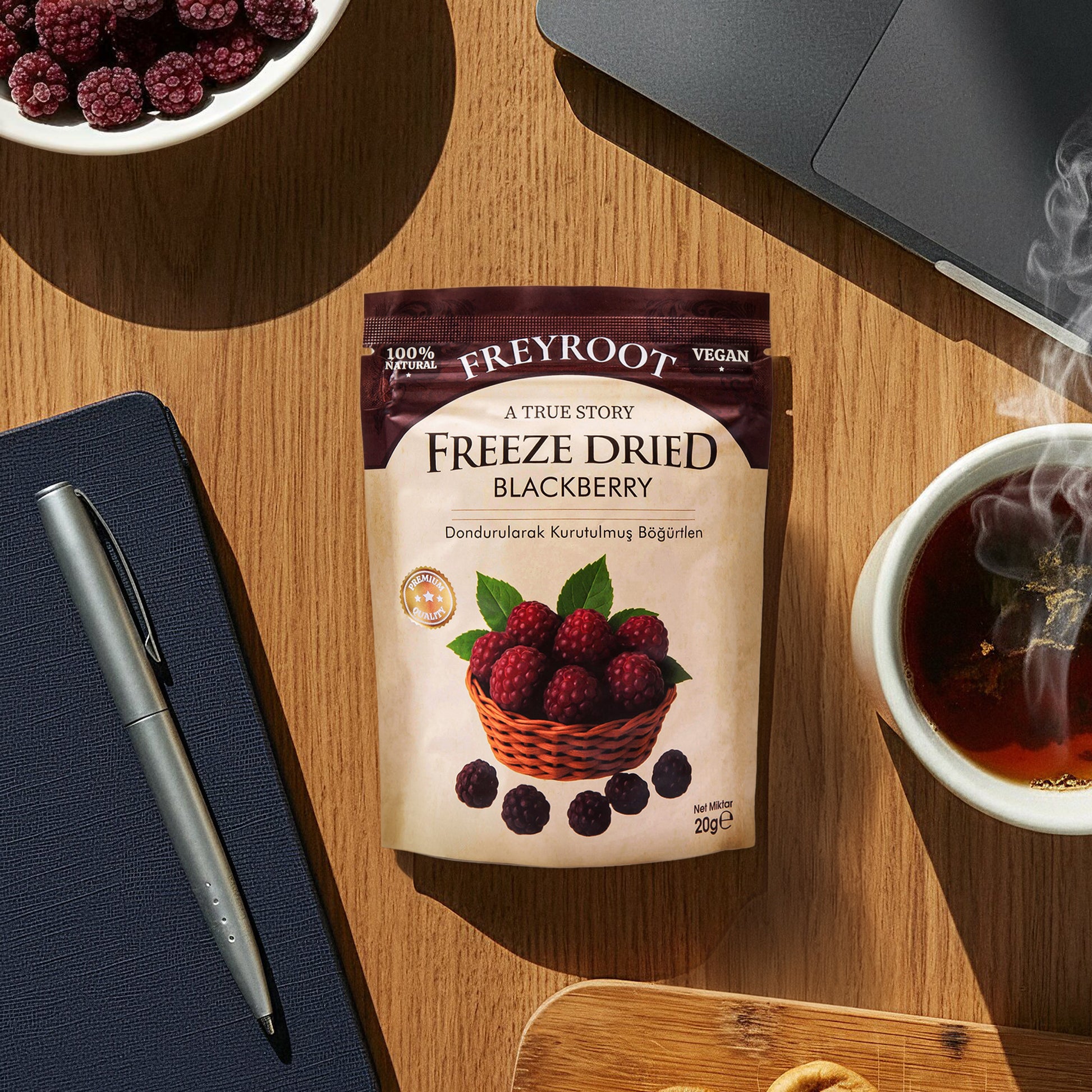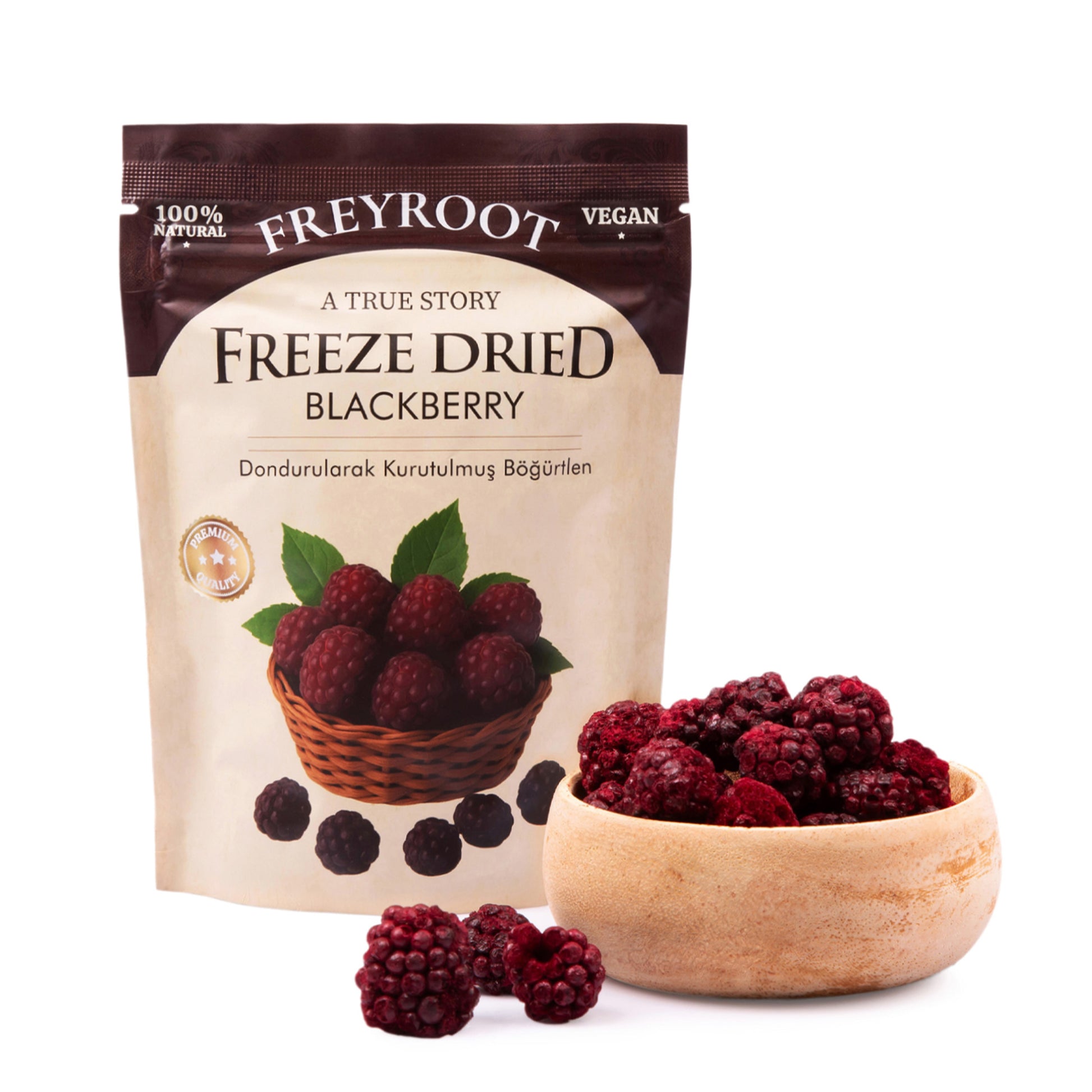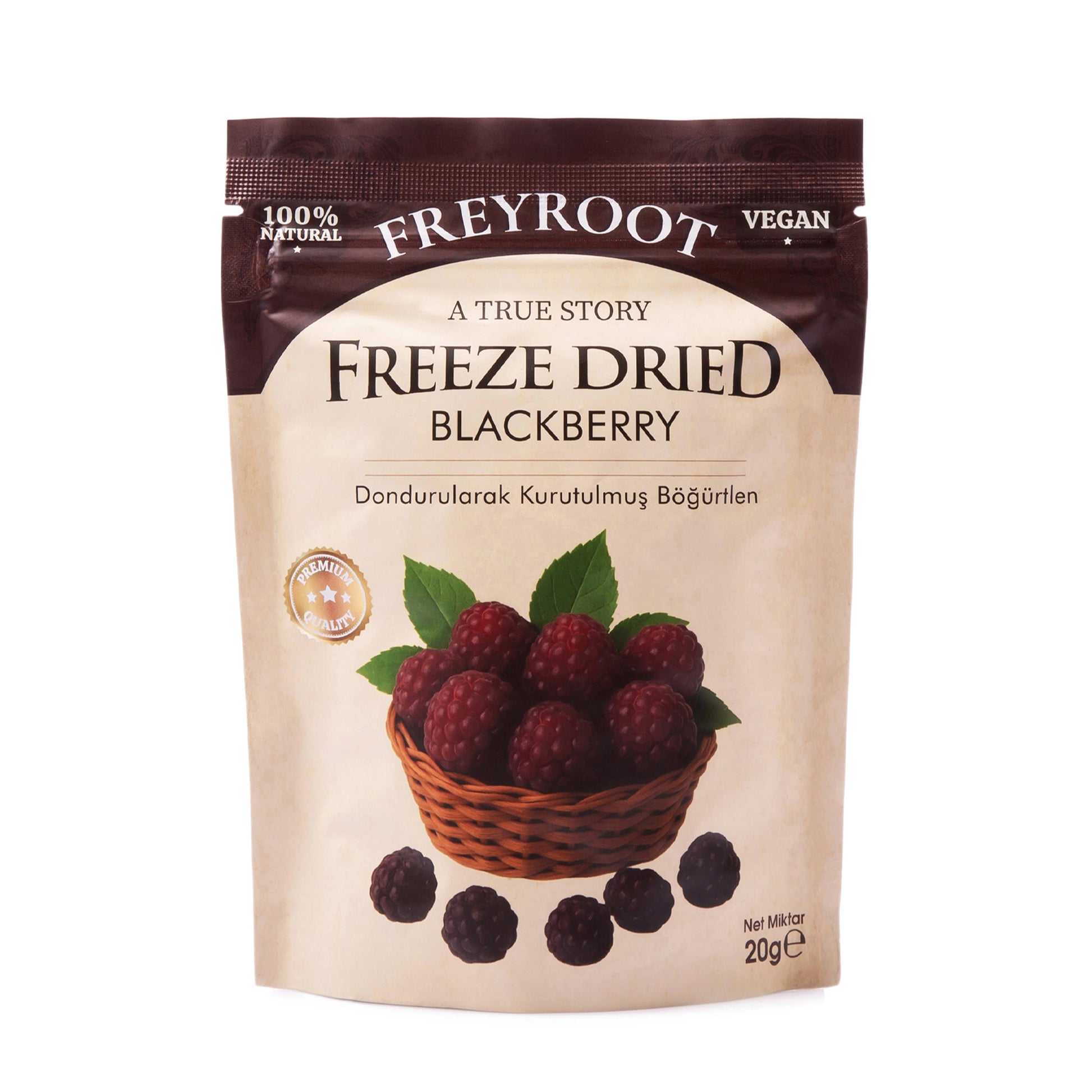 Freyroot Dondurularak Kurutulmuş Böğürtlen, yalnızca özenle seçilen taptaze böğürtlenlerden üretilir. Freeze dried teknolojisi sayesinde meyvenin doğal rengi, yoğun aroması ve besin değerleri korunur. İlave şeker, katkı veya koruyucu içermez; tamamen doğaldır.