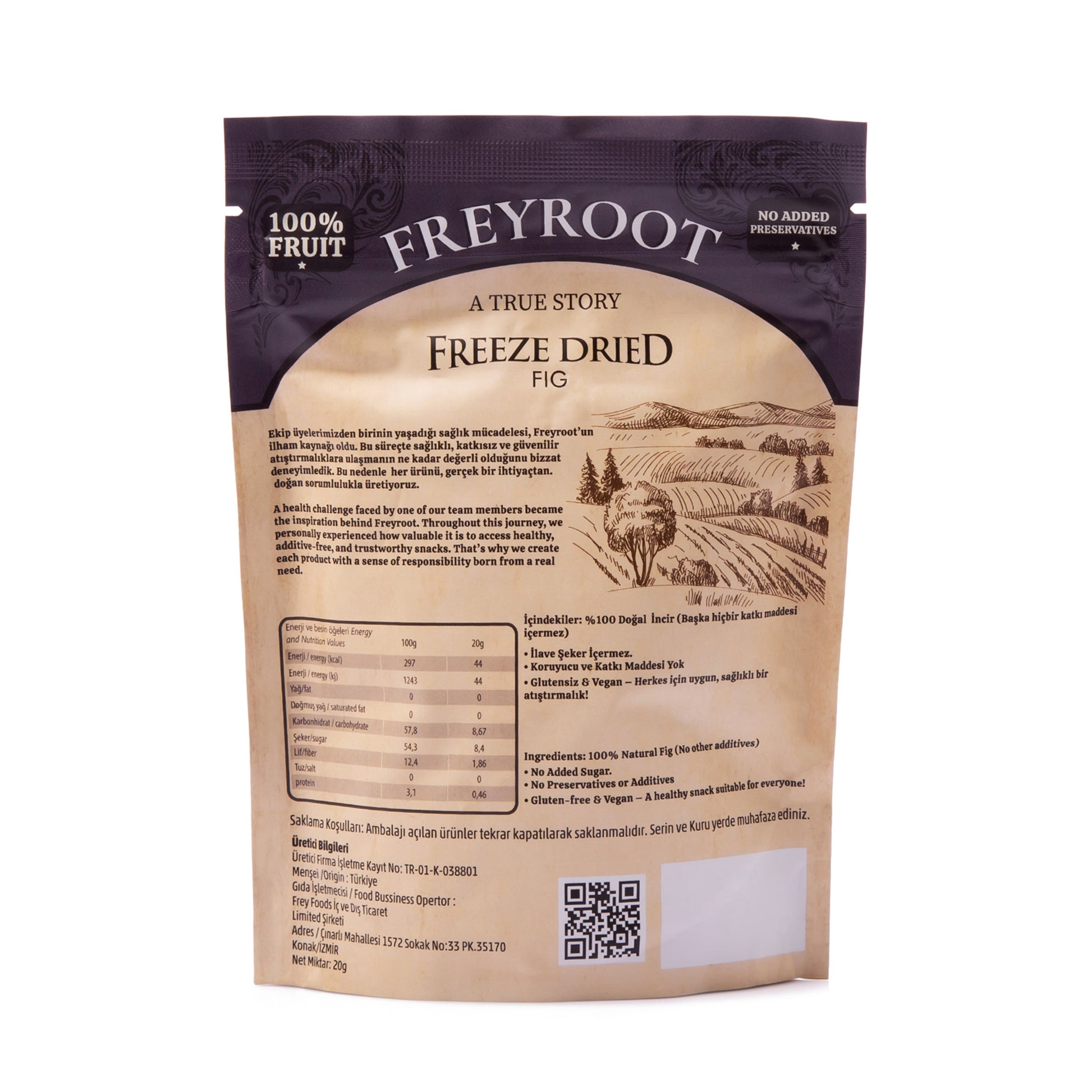 Freyroot Dondurularak Kurutulmuş İncir, özenle seçilen taze incirlerden hazırlanır. Freeze dried teknolojisi sayesinde incirin doğal tadı, rengi ve besin değerleri korunur. İlave şeker, katkı veya koruyucu içermez; tamamen doğaldır.
